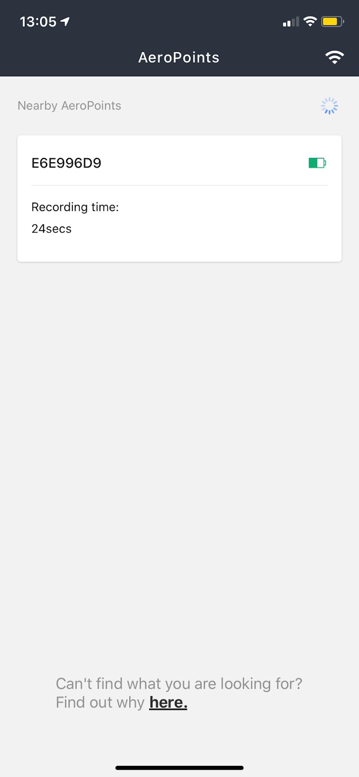 - Press the power button once to start logging a test capture. Open the AeroPoints app and confirm that the AeroPoint appears there.