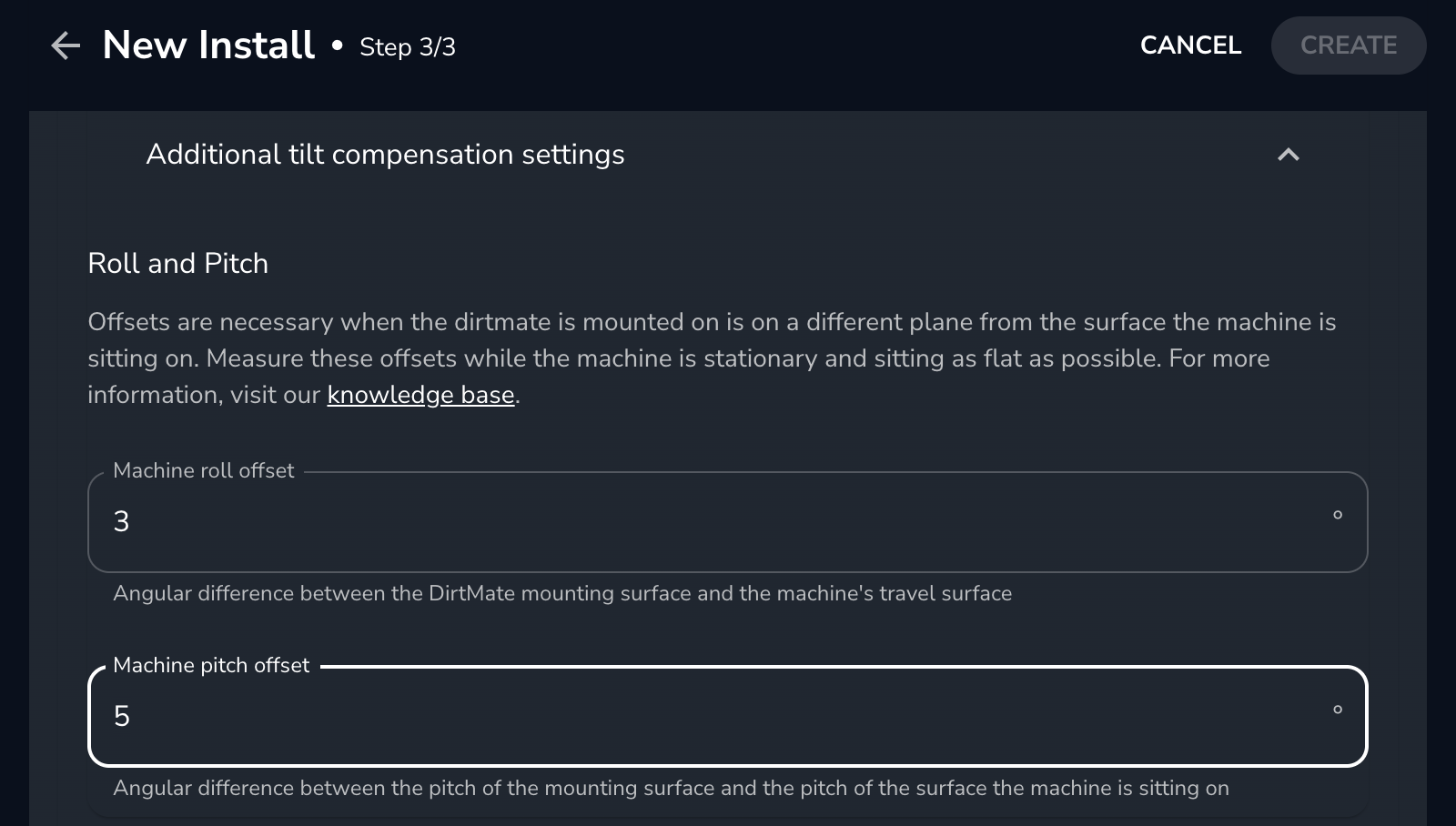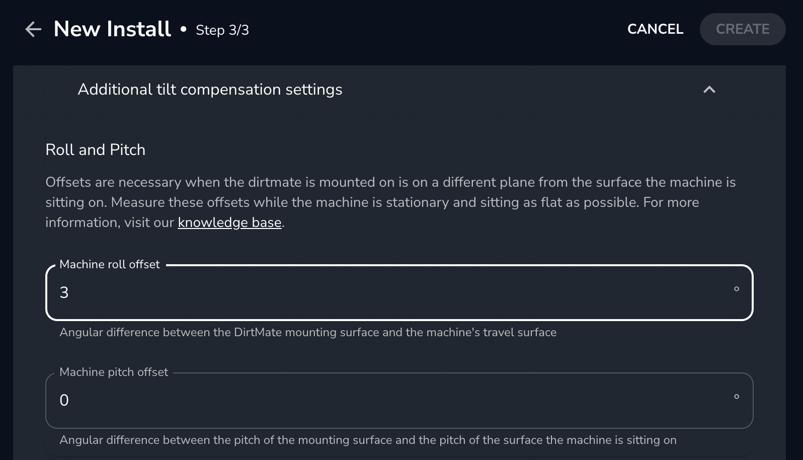 Enter the exact Machine roll offset (degrees) and Machine pitch offset (degrees) as required. These values compensate for the physical tilt of the mounting surface. An angle gauge can be used to take these measurements.