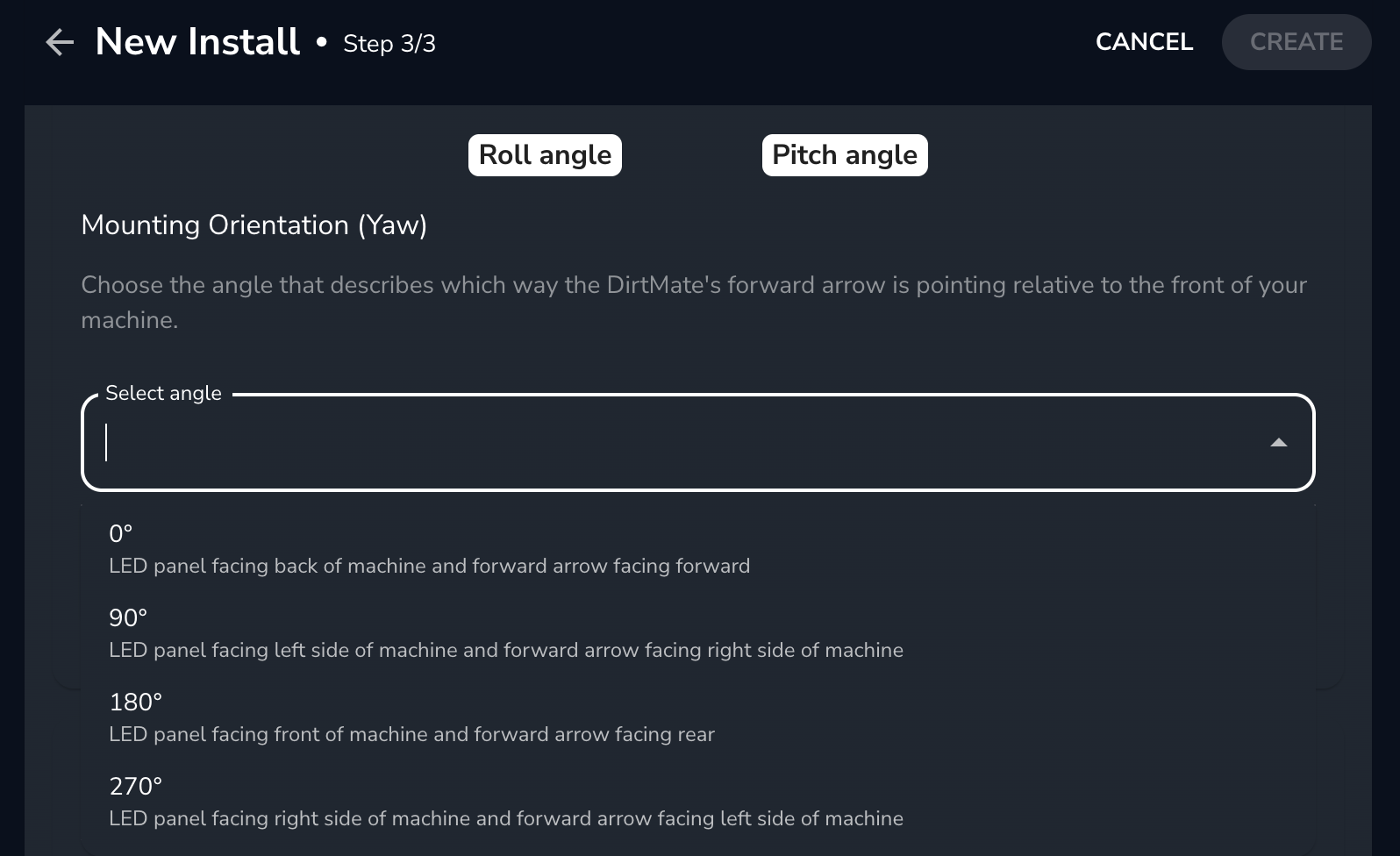 In the Mounting Orientation (Yaw) dropdown list, select the option that best reflects the DirtMate's rotation on the machine roof: