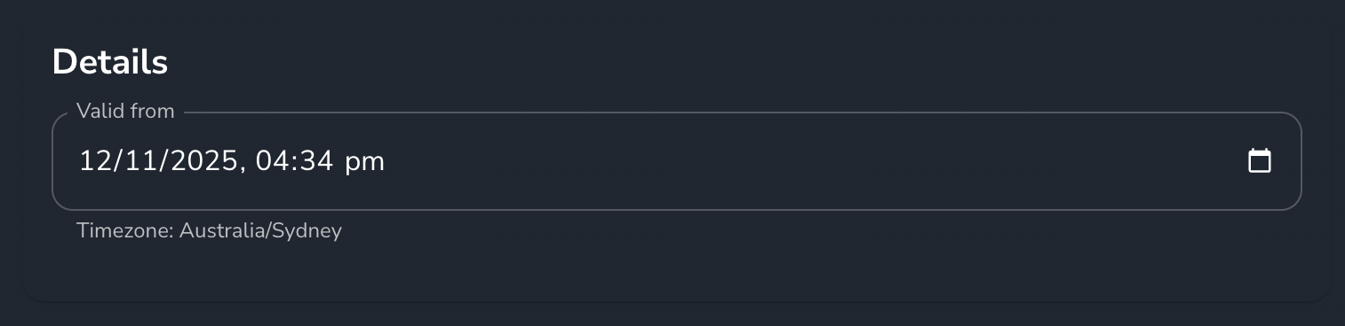 The Valid To time can be set according to when the DirtMate was installed to the equipment. For example, this can be two hours in the past, if the DirtMate was physically installed two hours prior and has not changed it’s installation configuration. This is also true for the future, if you want to “preset” DirtMate configurations.