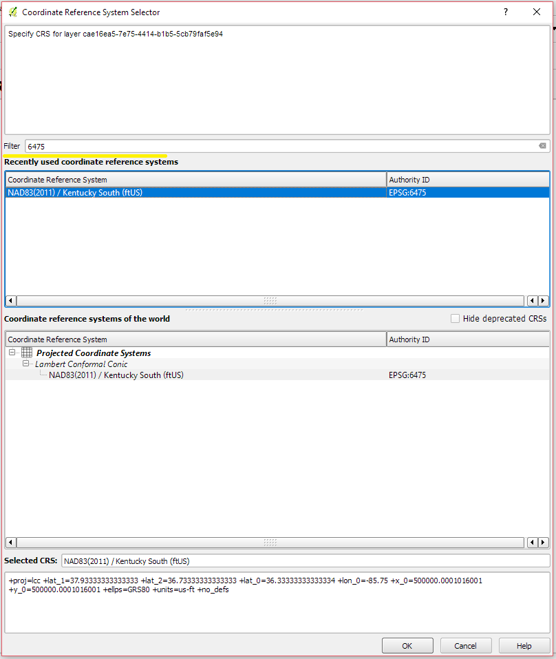 3. In the Coordinate Reference System Selector that appears, select the reference system that your data is in from the list and click OK. You can type the name or the EPSG code in the Filter field to search for the appropriate system.