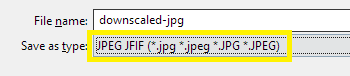 6. Click on the Select as type button for the Output file field. Choose where to save your downscaled JPEG and type in the desired filename. In the Save as type field, select JPEG JFIF from the list of options. Click Save.