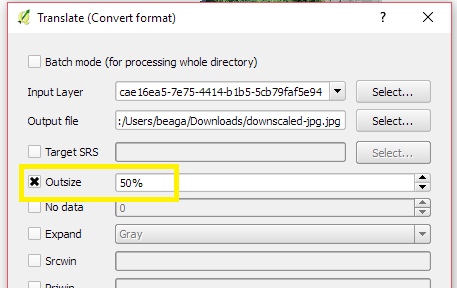 5. In the Translate (Convert Format) window that appears first, ensure that your JPEG file is entered in the Input Layer field (it should automatically be there, assuming it is the only file you have loaded into this QGIS session).
