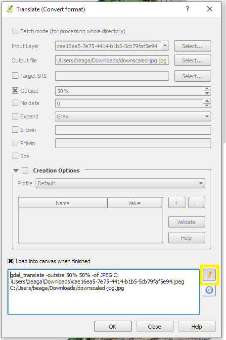 8. Once those details are complete, click on the pencil icon beside the text box with the gdal_translate script. This will grey out all the options above it and allow you to edit the script inside the text box.
