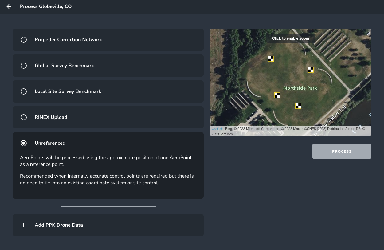 From the AEROPOINTS dashboard, choose the AeroPoint survey you want to process as unreferenced.