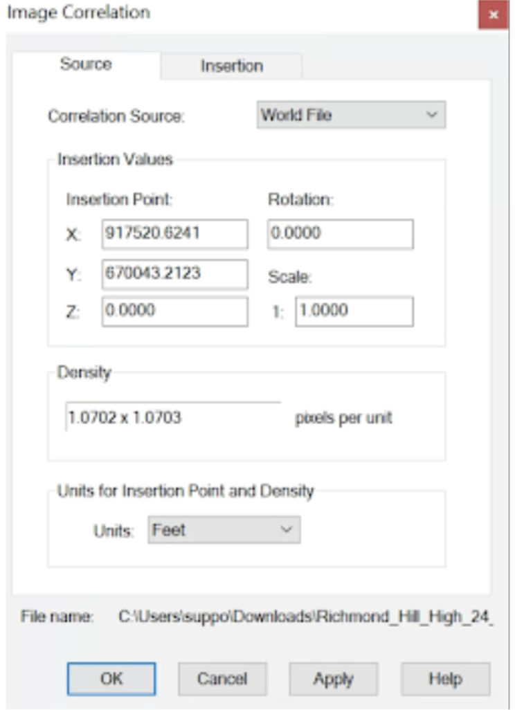 Note: If you download the JPEG orthophoto, a .WLD and .JGW file will be included. These will need to remain in the same folder as the JPEG so Civil 3D can correctly insert the orthophoto. Check the Modify Correlation box from the Insert Image dialog box so Civil 3D can read the .WLD file.