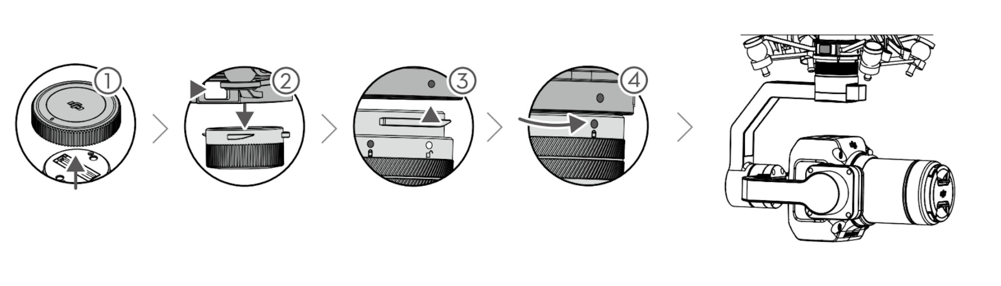 Align the white dot on the gimbal with the red dot on the aircraft and insert the gimbal.