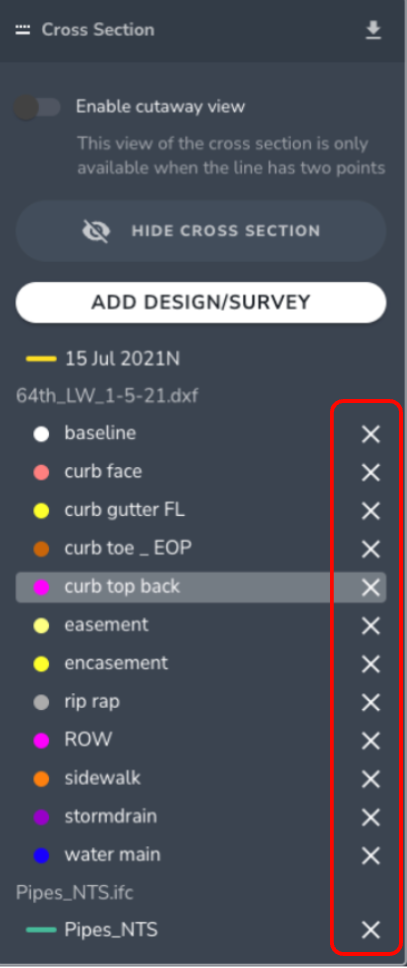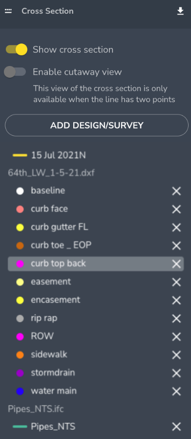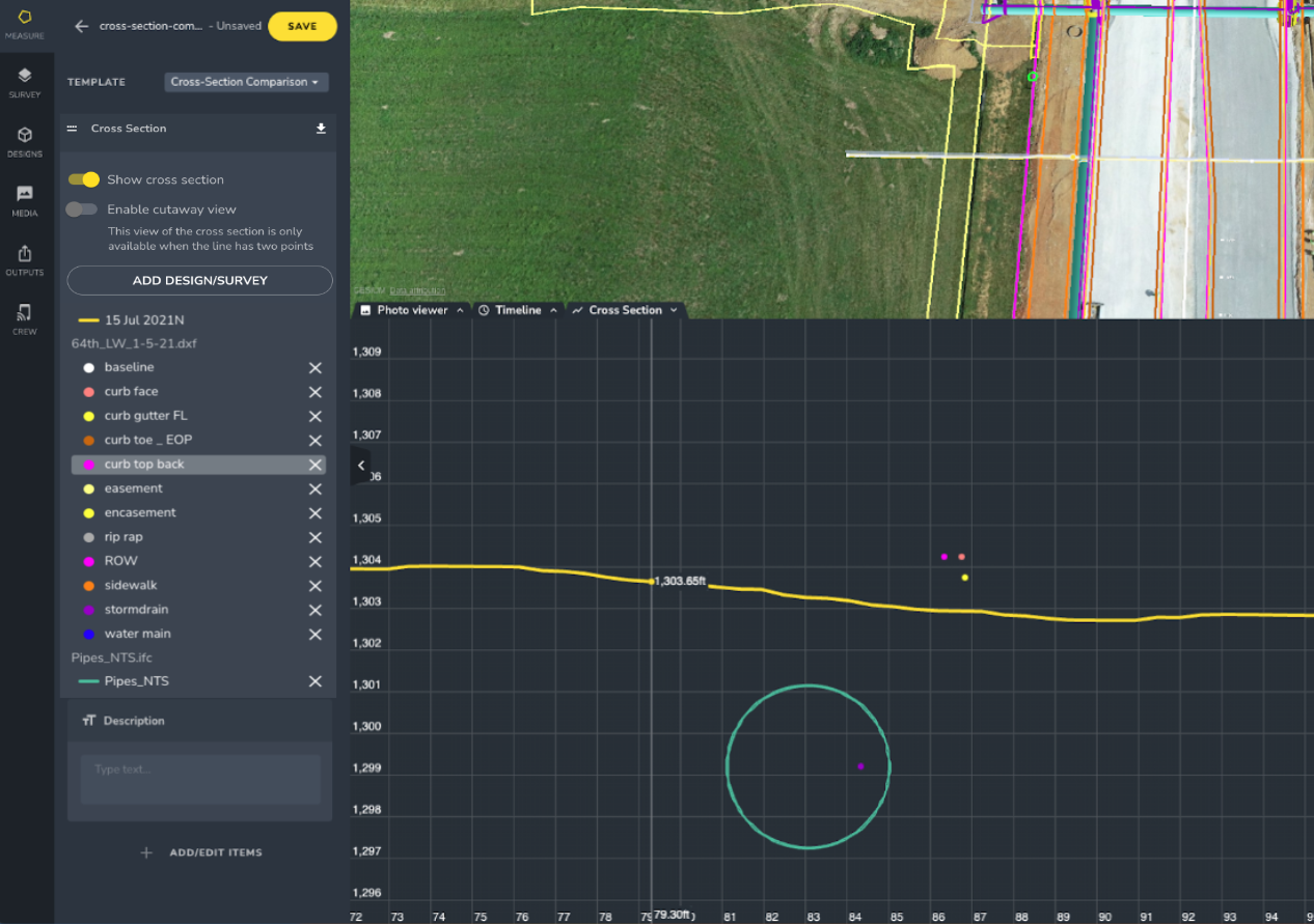 Comparing cross-sections to design files or other surveys across your site can be very useful for understanding and tracking earthwork progress, visualizing utility locations, and measuring distances between surveys and other design files.