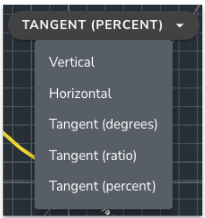 Use the drop-down to measure the Vertical, Horizontal, and Tangent (in degrees, ratio, or percent) between surveys and files.