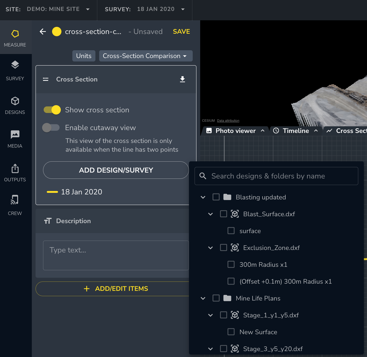 Click the ADD DESIGN/SURVEY button to add more surveys or designs to view how this site has changed throughout a project.