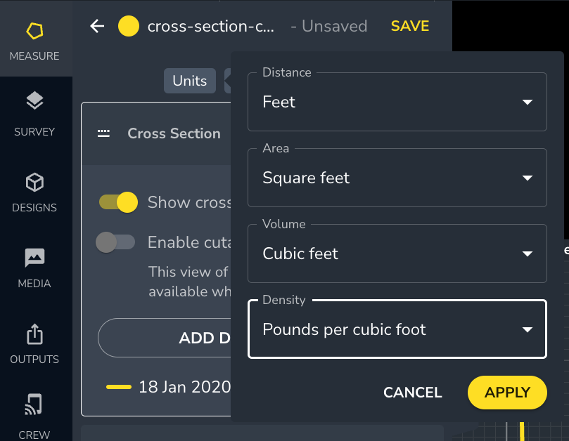 Select the most appropriate measurement unit for distance, area, volume, and density from the dropdown menu. This makes it easy to move between imperial and metric units as needed and create reports in your preferred units.