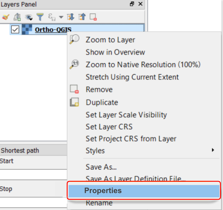 3. Once confirmed that the image data has the correct bit-depth value, import the raster into the QGIS platform. Under the Layer Panel, right-click the image layer and navigate to Properties.