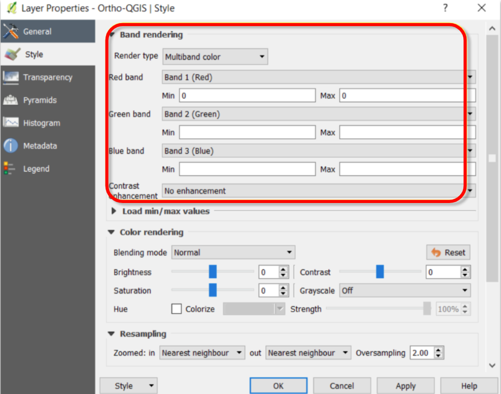 4. This will prompt the Layer Properties Dialogue Box. Navigate to the Style Tab and set the proper bands to their correct band channel. Click Apply, then OK.