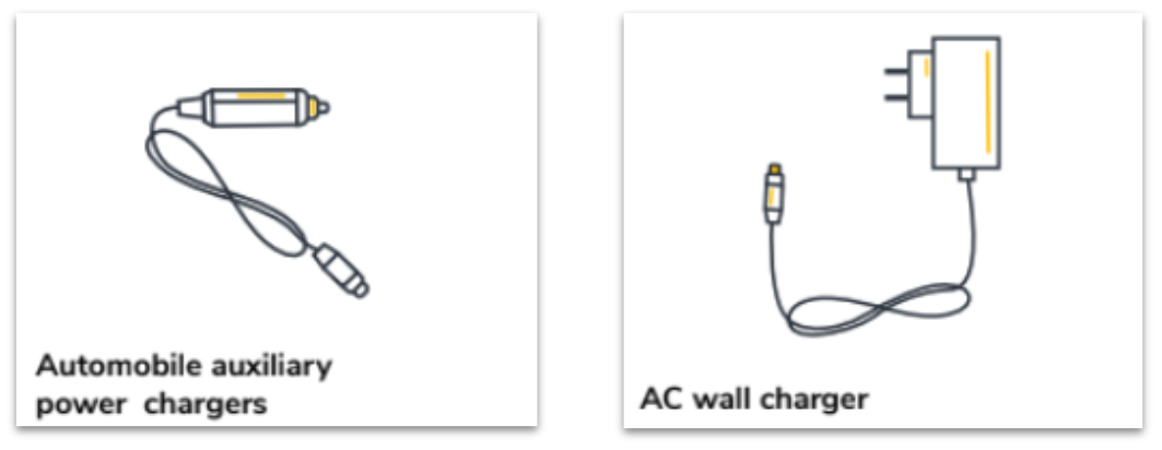 3. Plug in the provided charging cable and connect to the power source (use the automobile auxiliary power charger if charging through the machine or the AC wall charger if charging through an electric wall outlet).