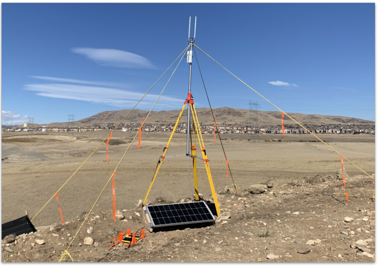 The above image shows a 130w solar panel setup to power the Network Gateway for a remote installation. Be sure to aim the panel to capture the path of the sun. Elevate the panel from the ground, and face it in a solar-favoring direction. Follow the solar panel manufacturer recommendations for this type of arrangement.