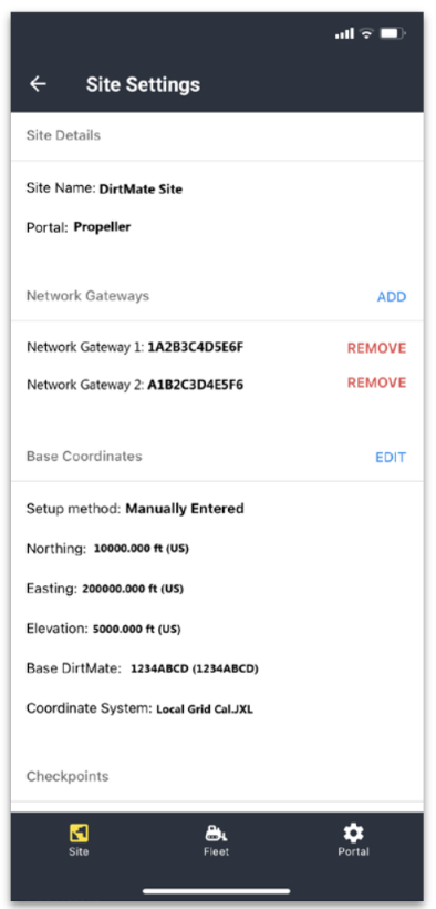 1. Open the DirtMate app and open the site tab. In the top left corner, select the site where you want to edit the Network Gateways.