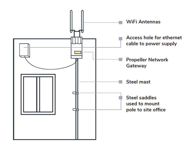 The image above shows an installation of the Network Gateway and antennas on a mast directly mounted to a temporary site office.
