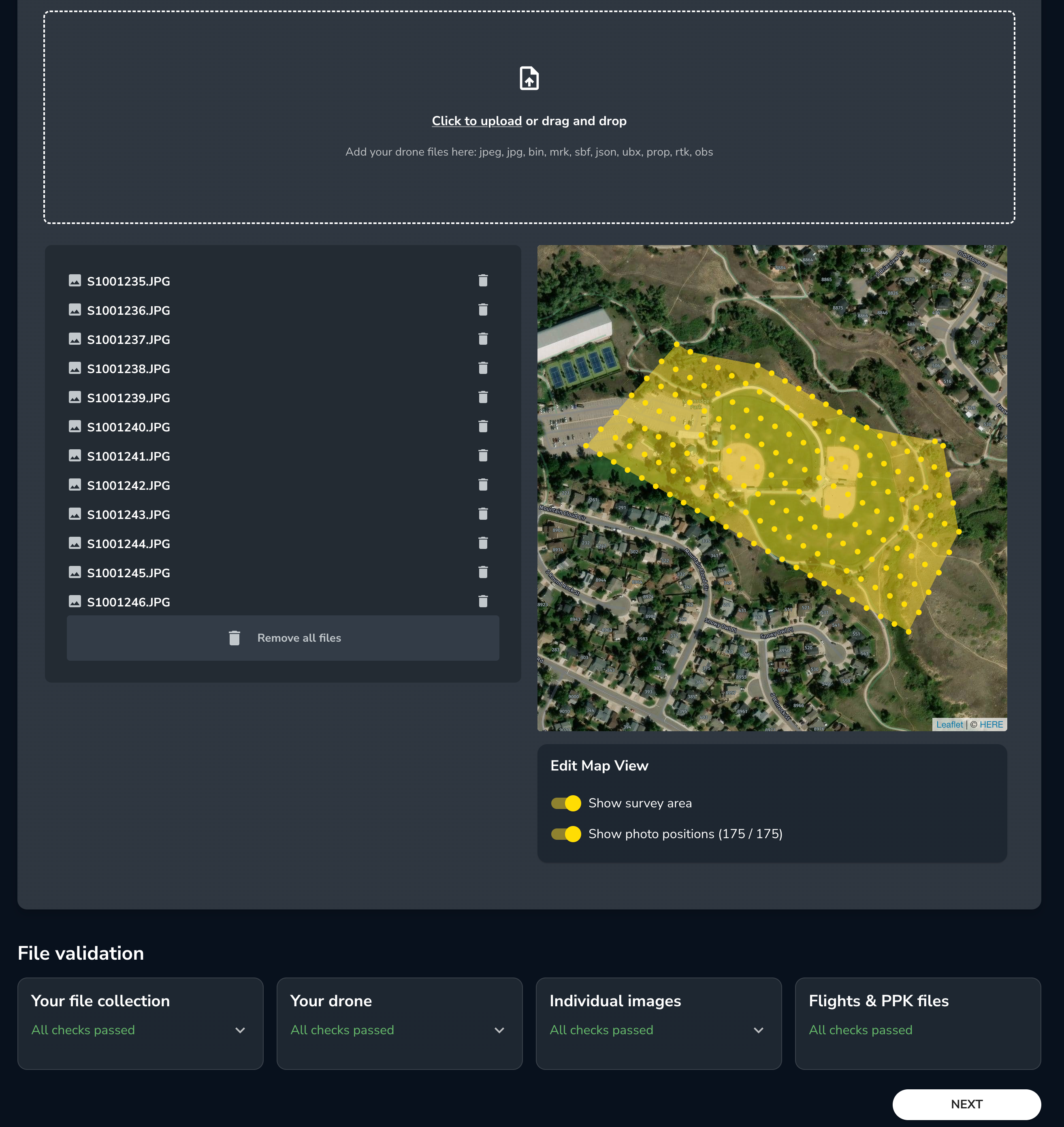 Once the selected files have been validated, a map will appear with the location of your photos and survey area.