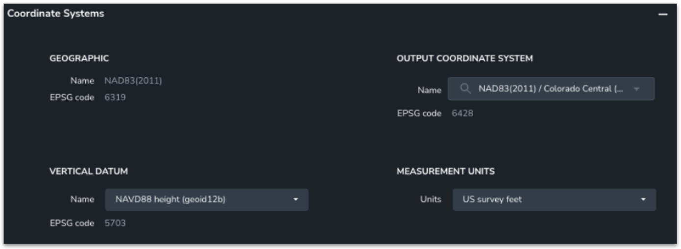 1. Once the survey has been processed, set its OUTPUT COORDINATE SYSTEM and VERTICAL DATUM to the same CRS information as the site to which the lidar data will be uploaded.