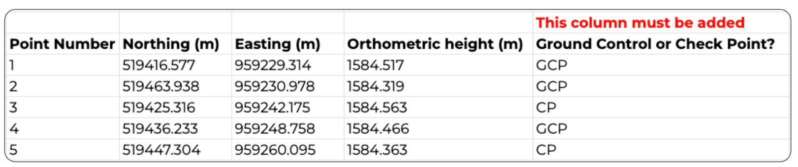 3. Add a column to the downloaded CSV(Simple) file. This column must be populated entirely and indicate whether each point should be used as a ground control or checkpoint. If nothing is filled out, we’ll label the point as ground control by default.