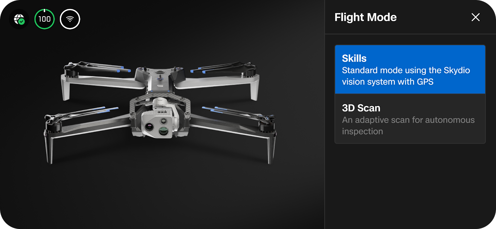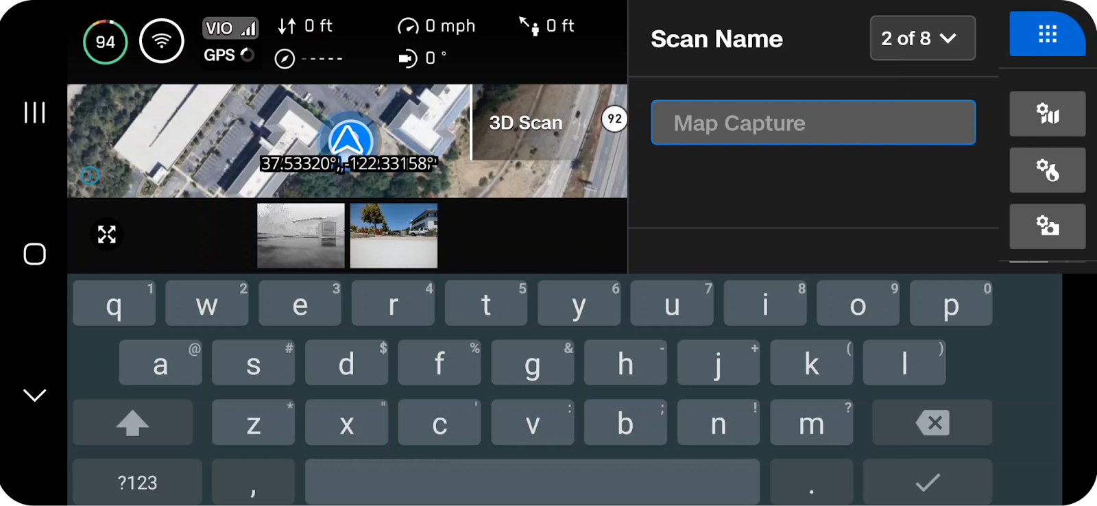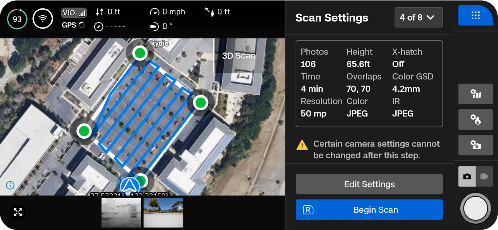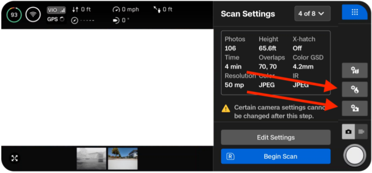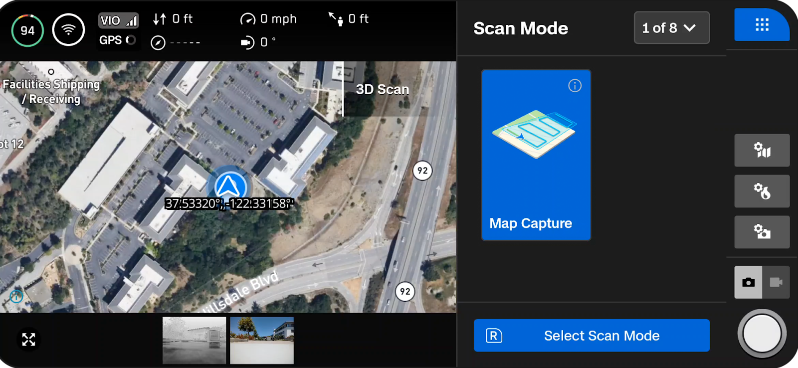 - Tap Switch Mode and select “3D Scan”. (A menu will pop out from the right side, displaying available Flight Modes).