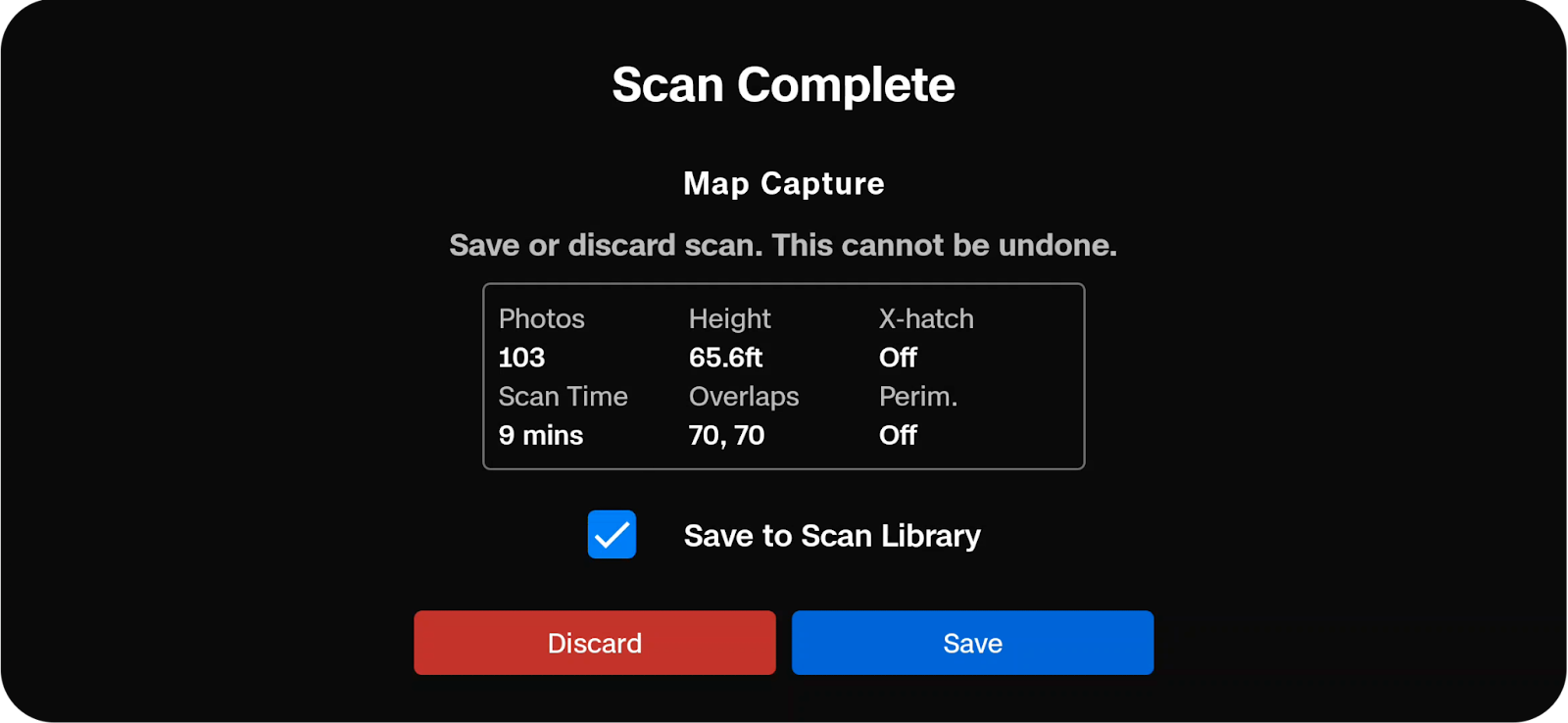 Caution: Do not remove the battery or power off during any post-flight tasks. Doing so will result in loss of data. Do not power off or disconnect from the drone until you return to the "Begin Flight" screen. - Save your scan after your mission is complete.
